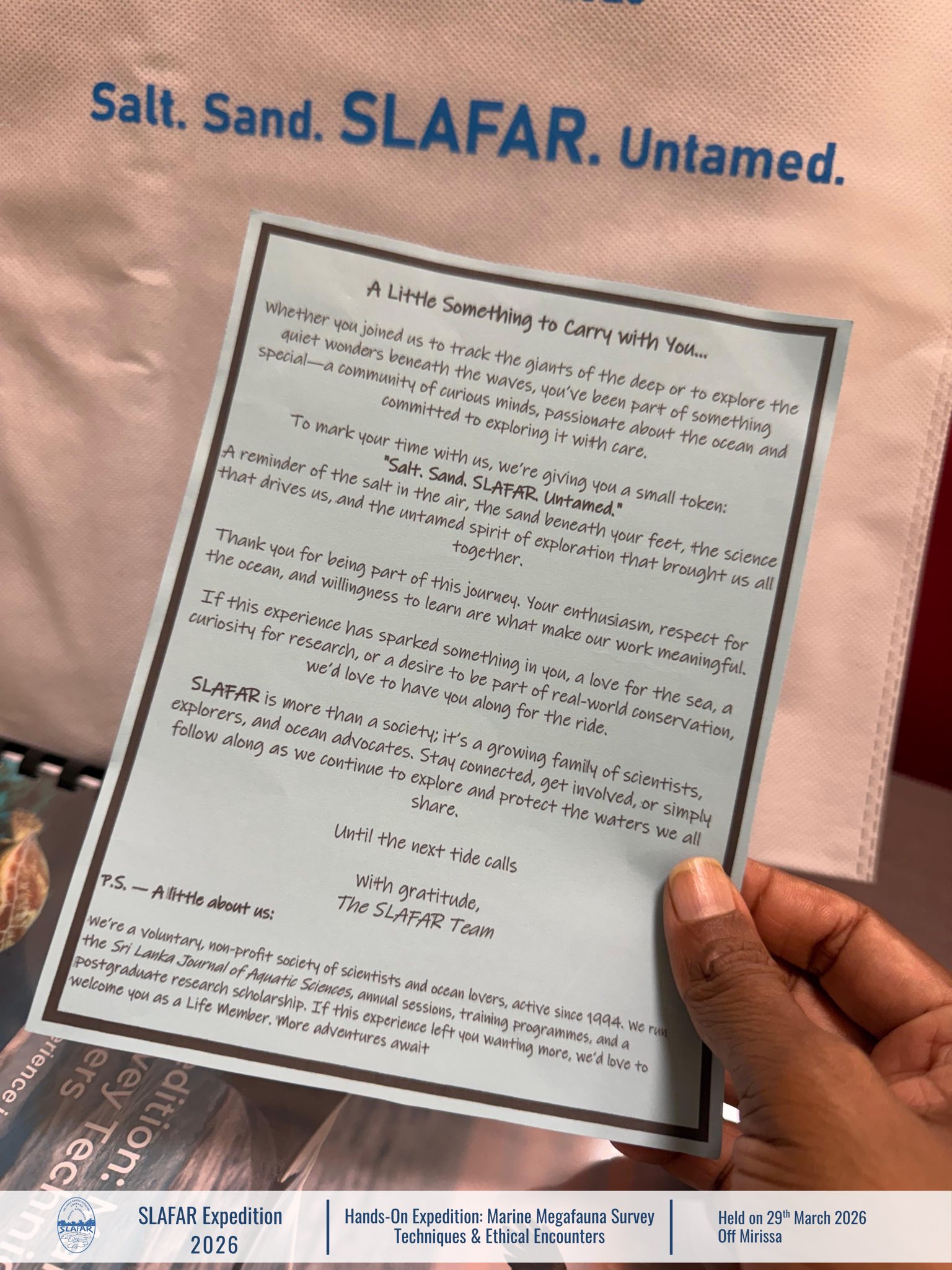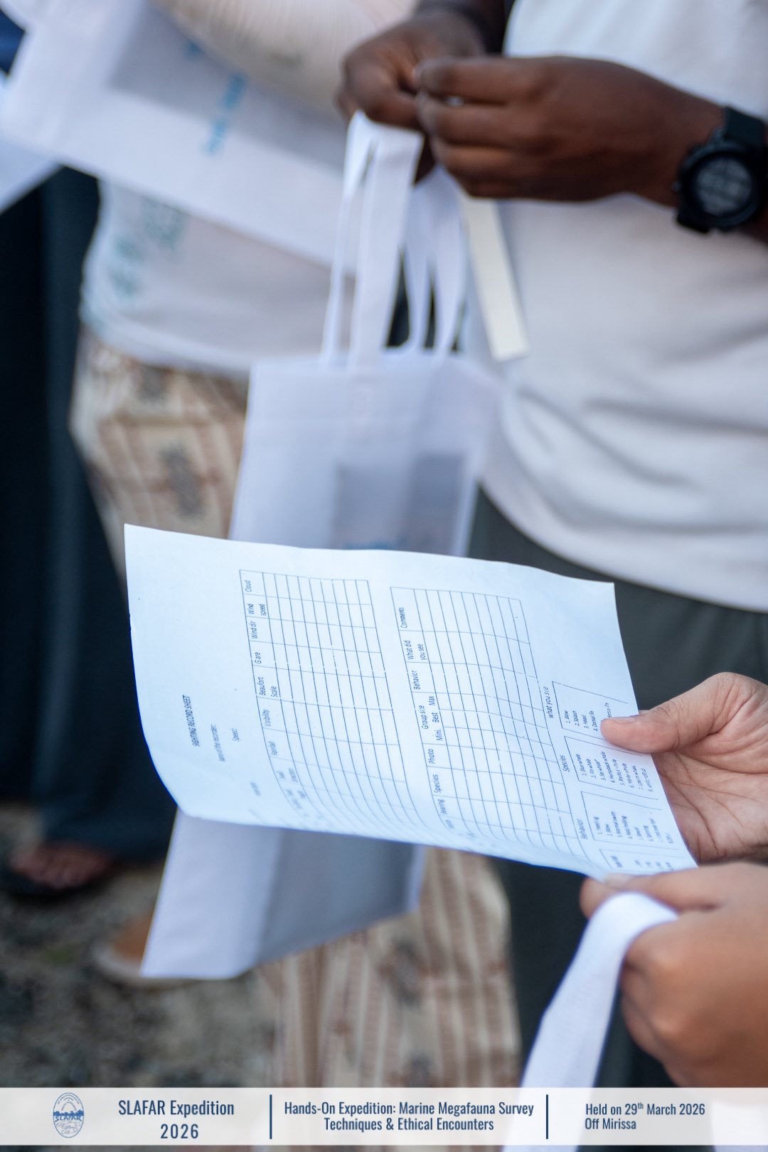 SLAFAR, in collaboration with NARA, successfully concluded our exclusive hands-on expedition in Mirissa, where we turned the ocean into a living classroom. Participants immersed themselves in real-world marine megafauna survey techniques.